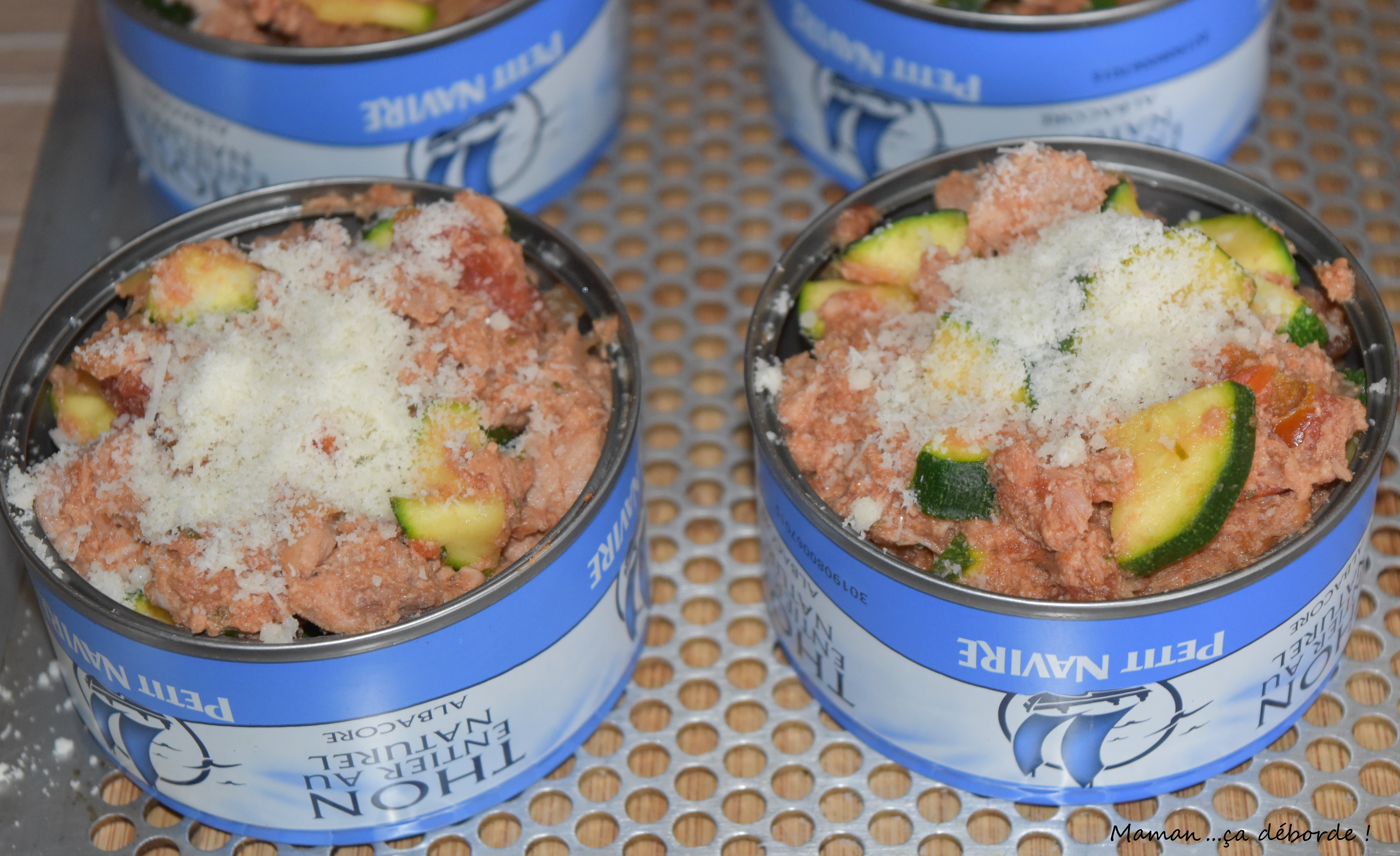 Répartissez le mélange dans les boites de thon. J’ai eu plus de garniture que ce que pouvait contenir mes 4 boîtes de thon alors j’ai réparti le reste dans 2 cassolettes.