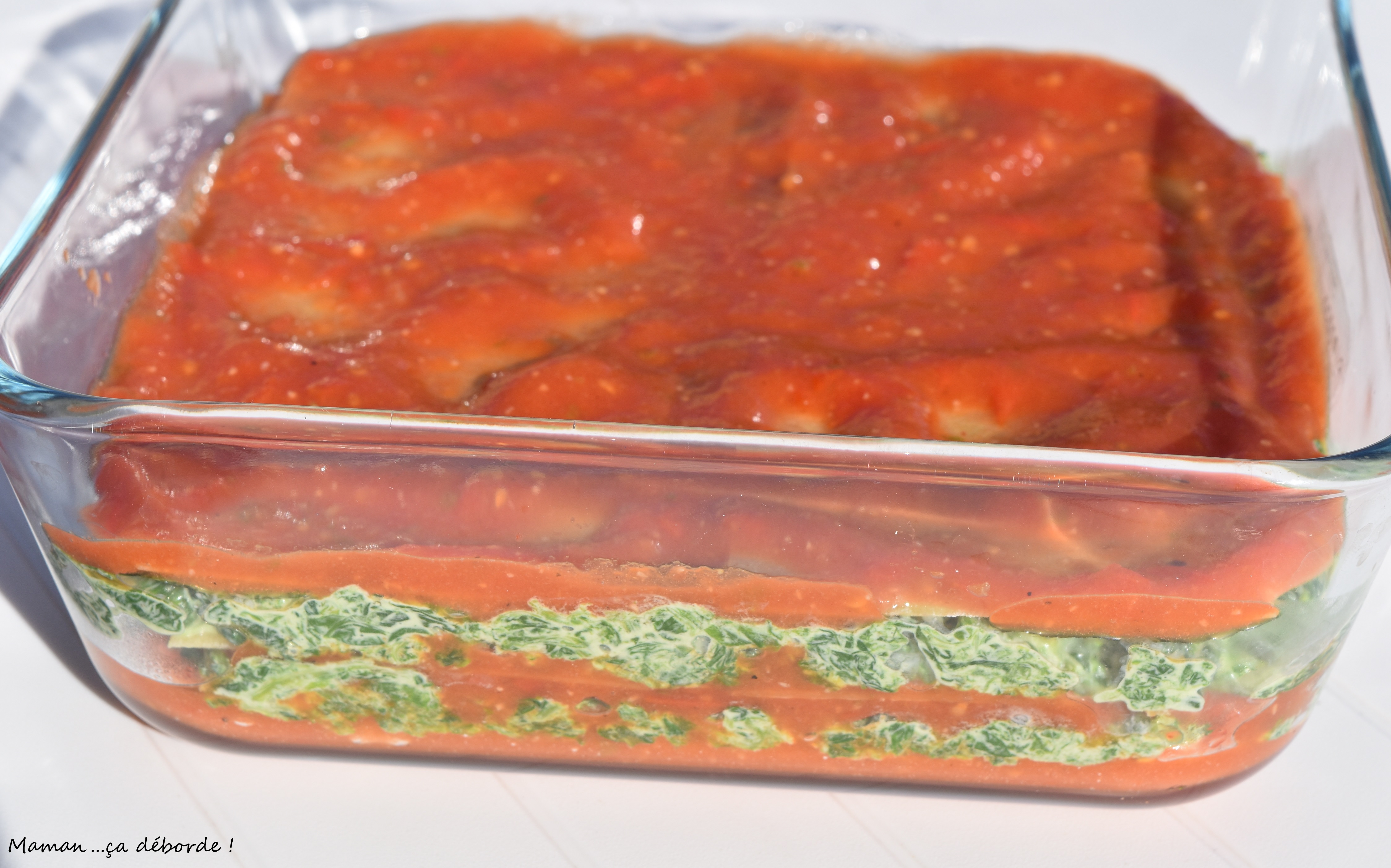 Dans votre plat à lasagne, versez une couche de sauce tomate puis une couche de plaques de lasagne, une couche épinard/ricotta et ainsi de suite.