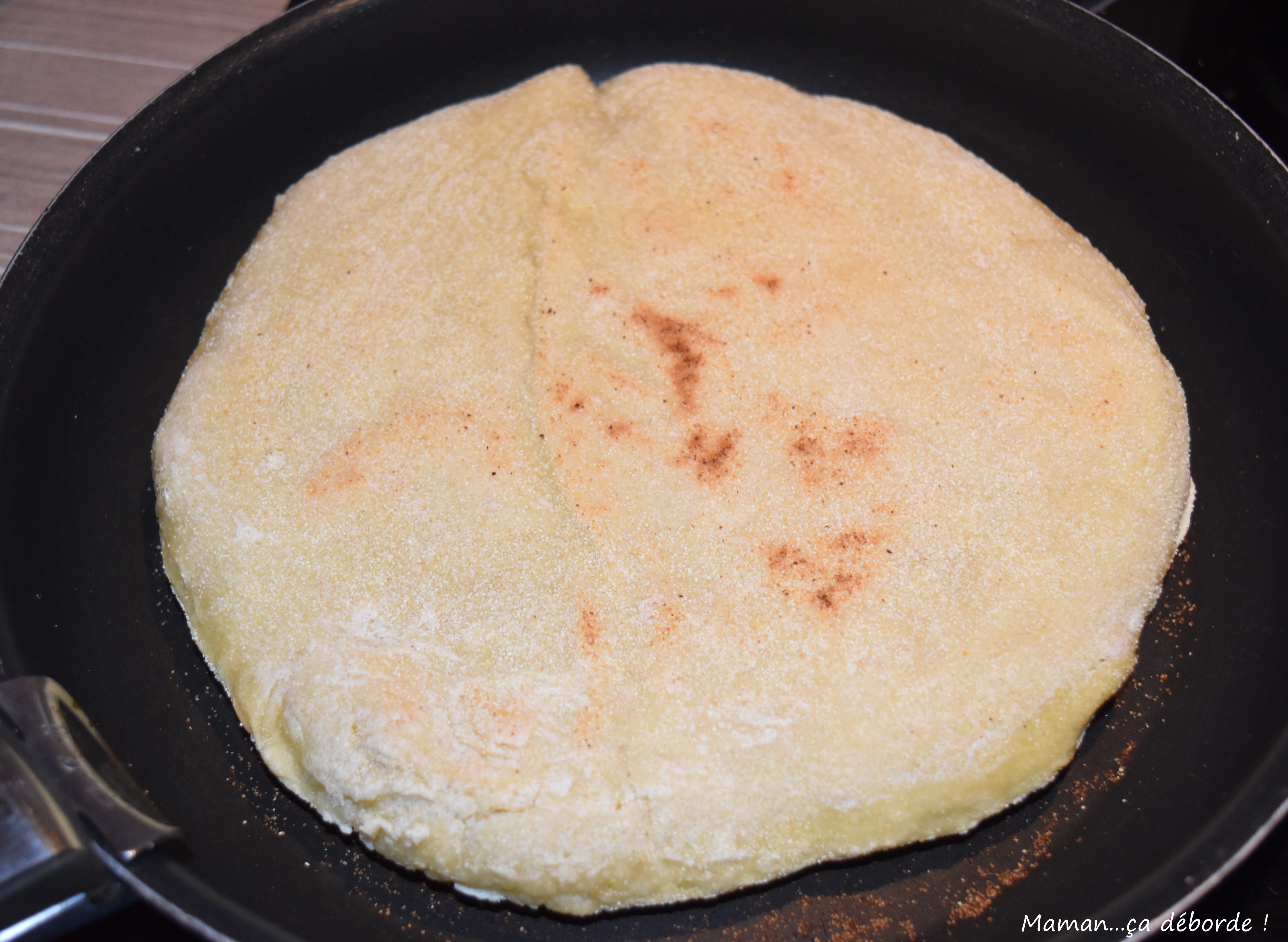 Retirez le cercle si vous en avez mis un, puis soulevez délicatement votre pain du papier sulfurisé et placez-le dans la poêle chaude.