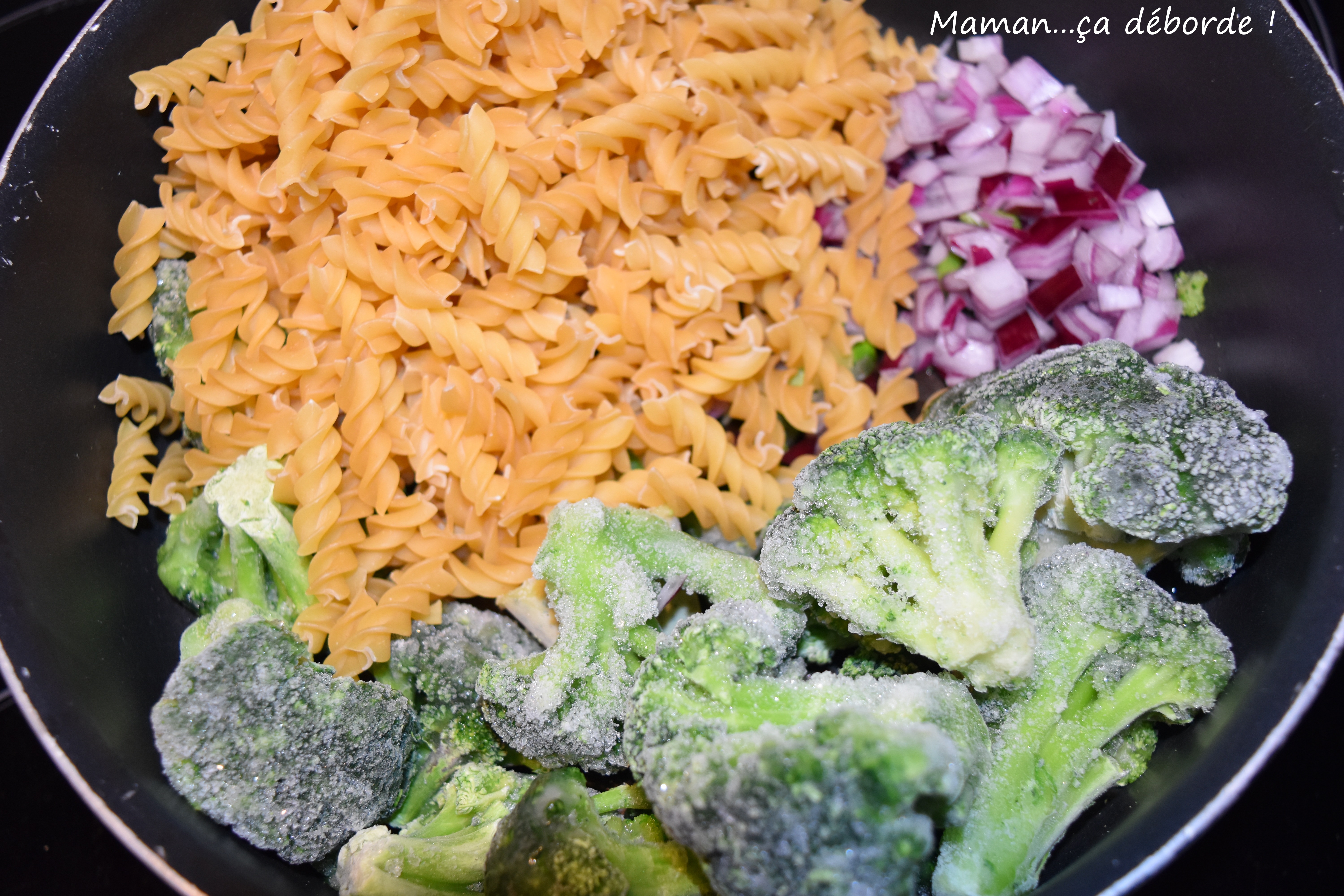 Dans une grande sauteuse ou un faitout, déposez vos pâtes, l’oignon émincé, le brocoli, le pesto et versez l’eau.