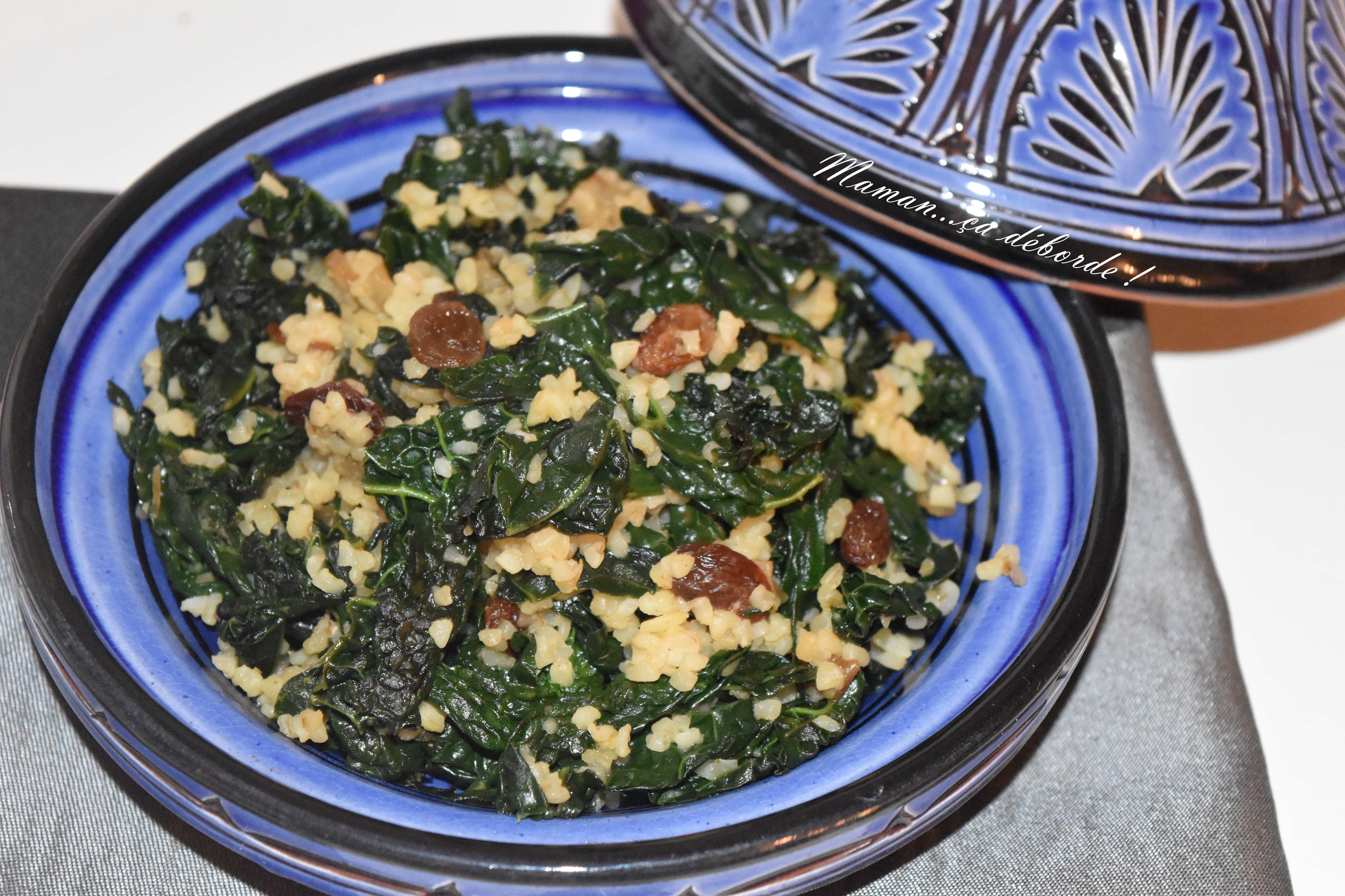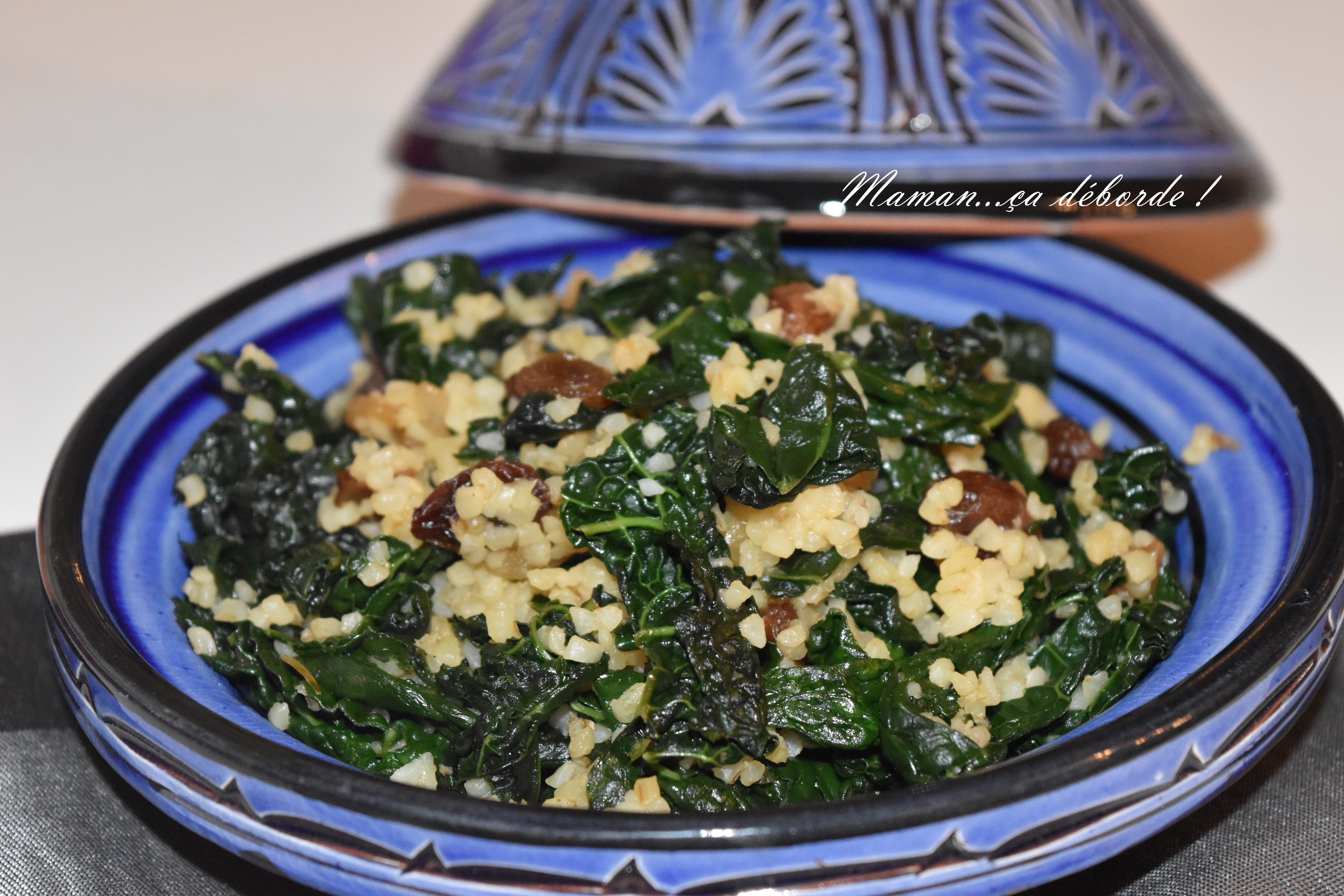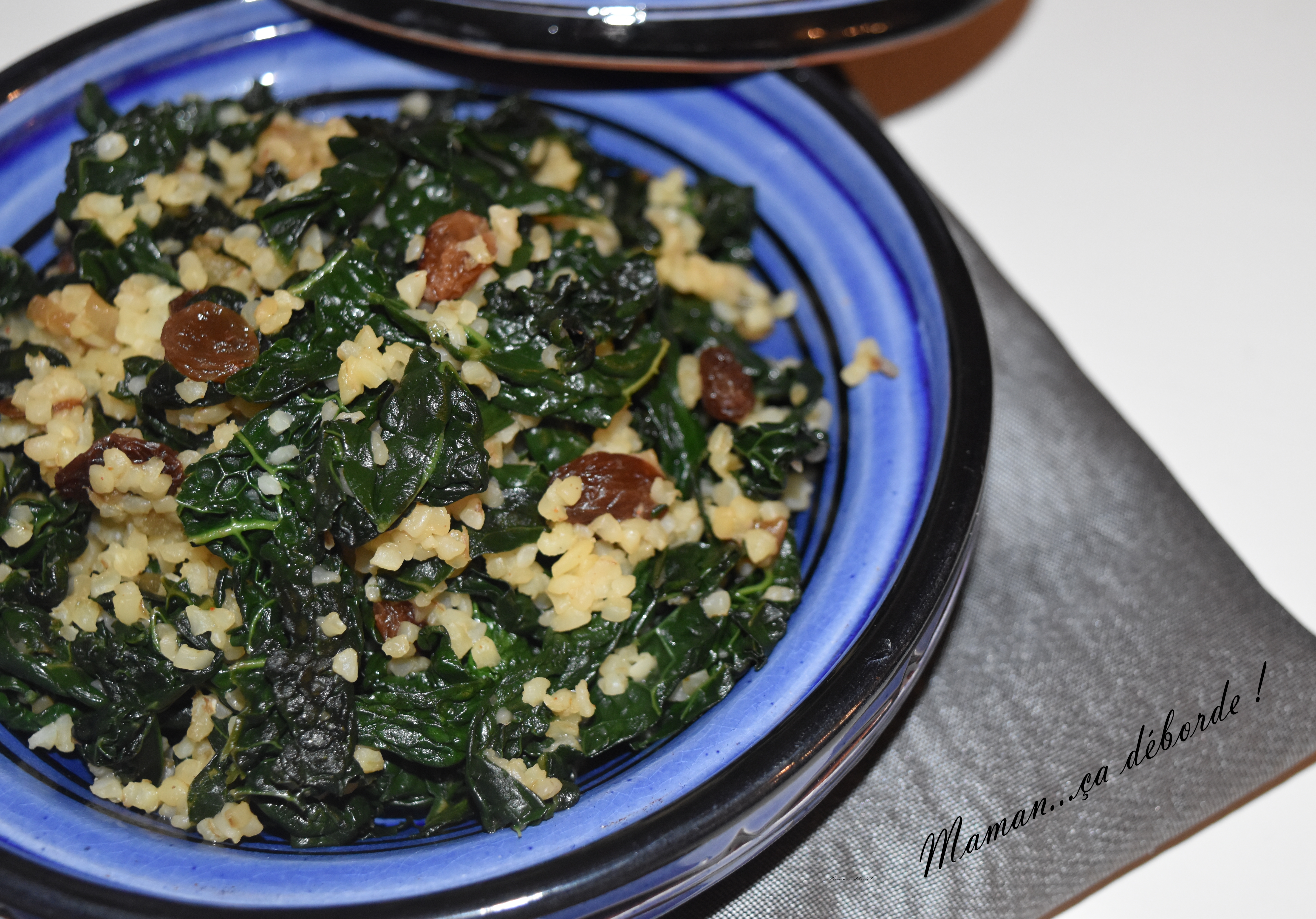 Je ne pensais pas en publier la recette mais lorsque j’ai goûté cette poêlée de chou kalé, boulghour et raisins secs, je me suis dit qu’elle était drôlement bonne et que je devais la partager avec vous.