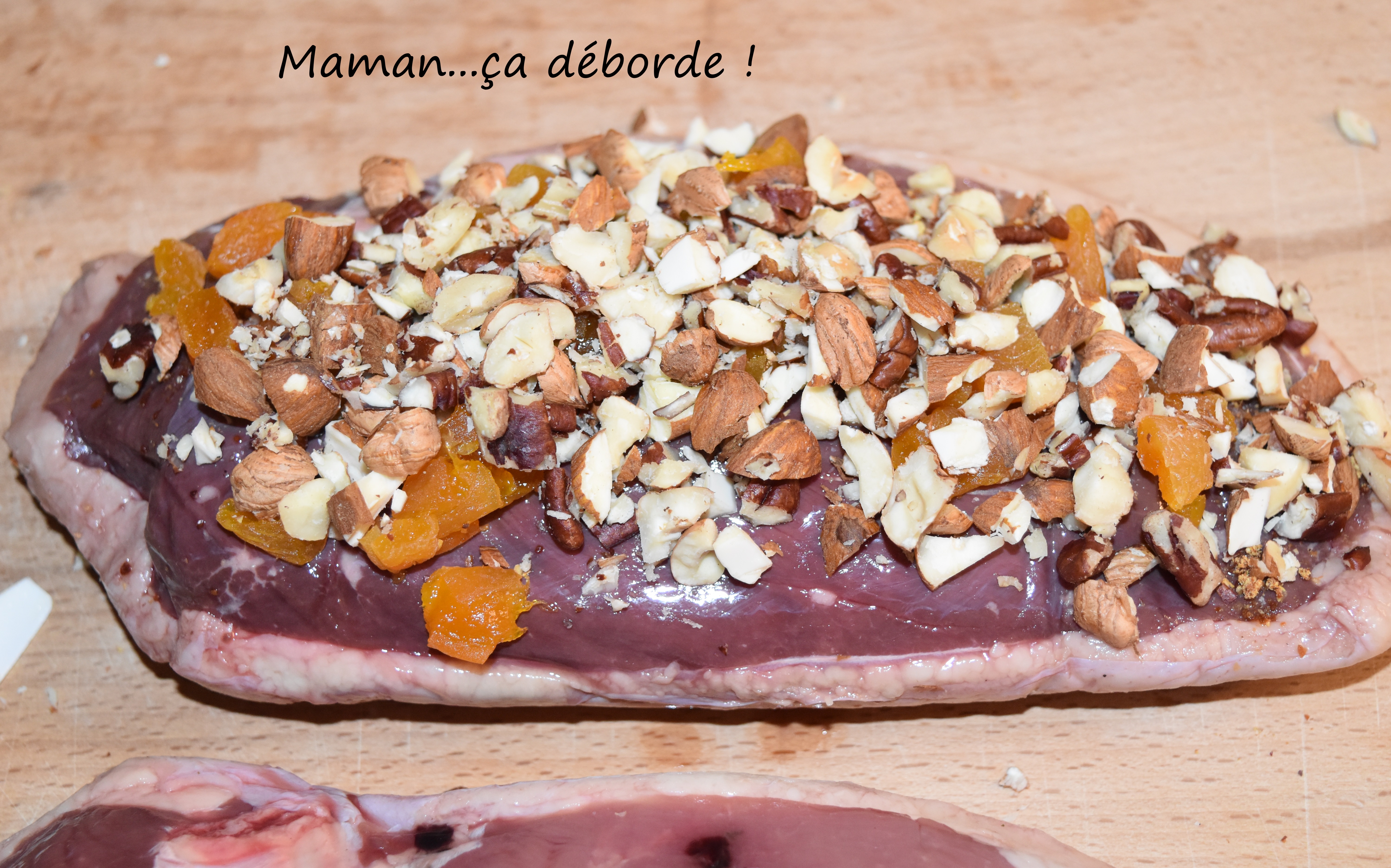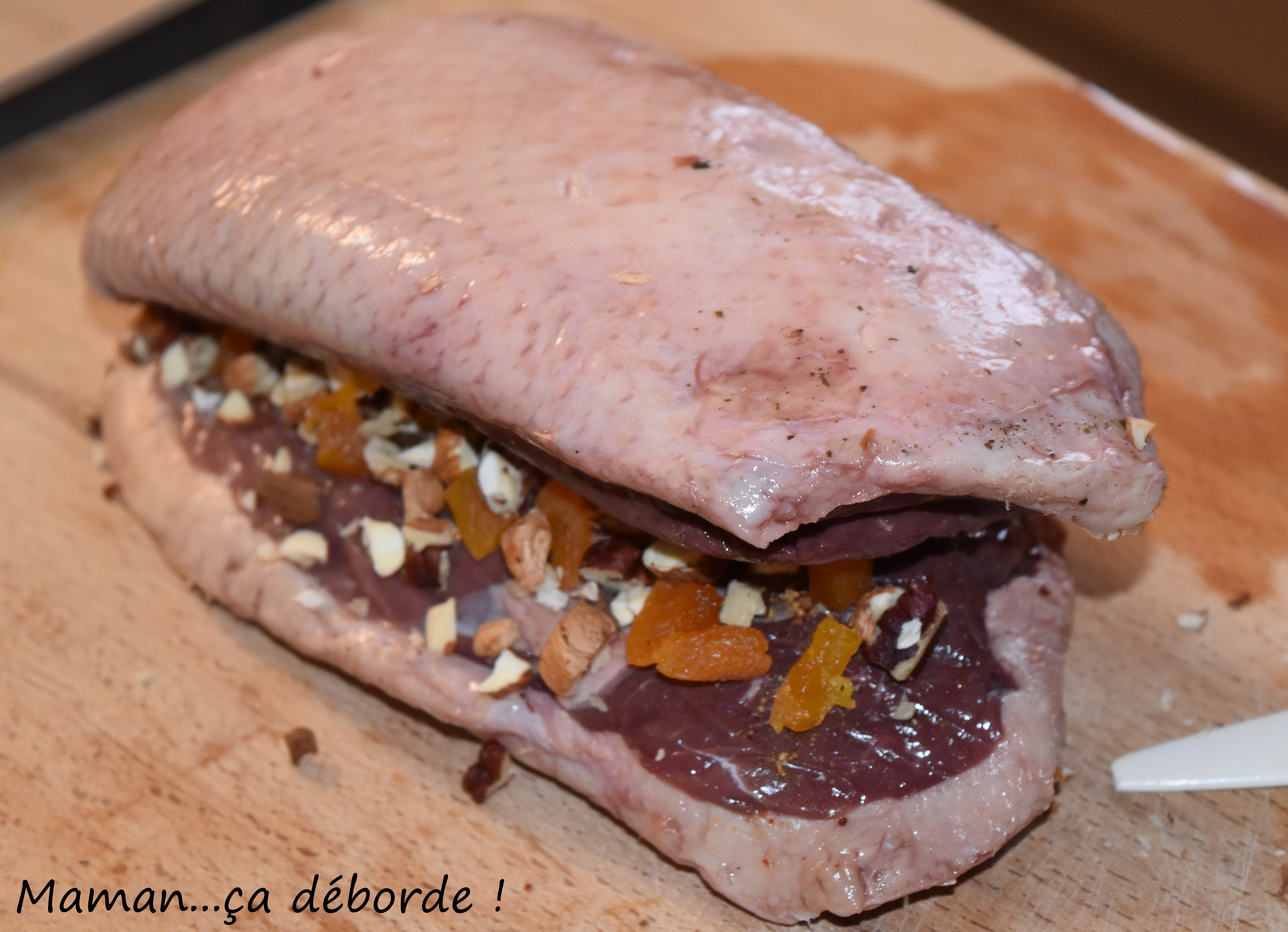 Sur une planche, déposez les magrets sur la peau (coté chair vers vous) et assaisonnez-les de sel et de piment d’Espelette puis sur un des magrets parsemez des fruits secs et abricots hachés.