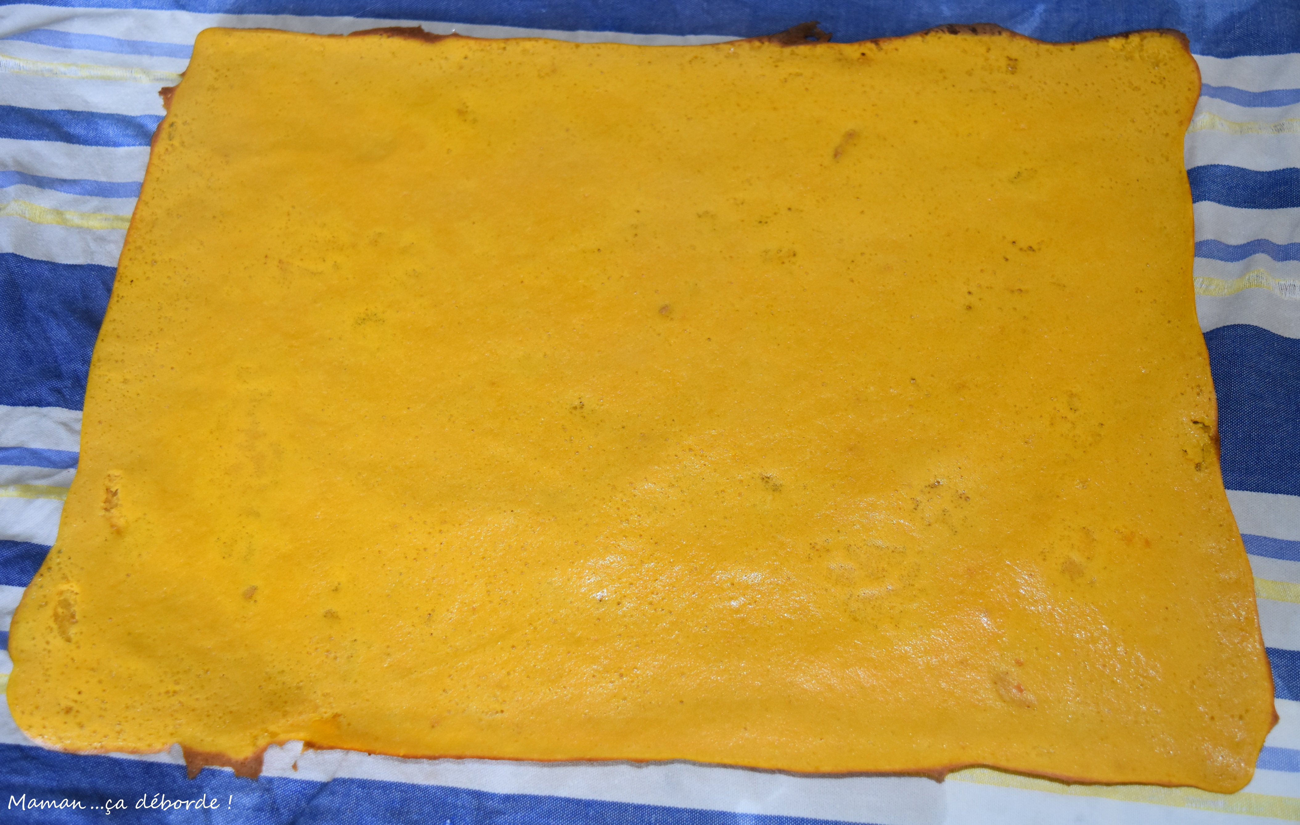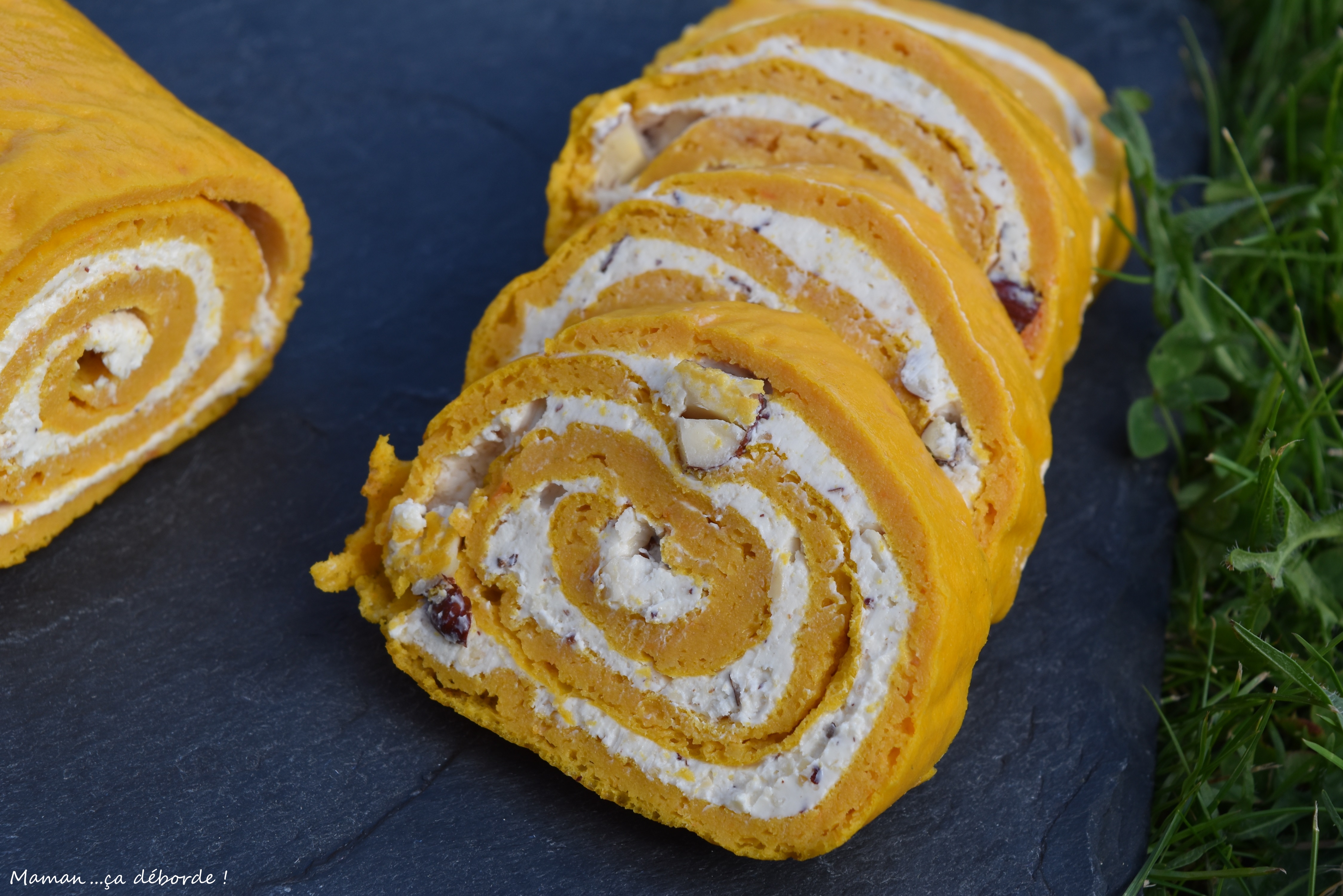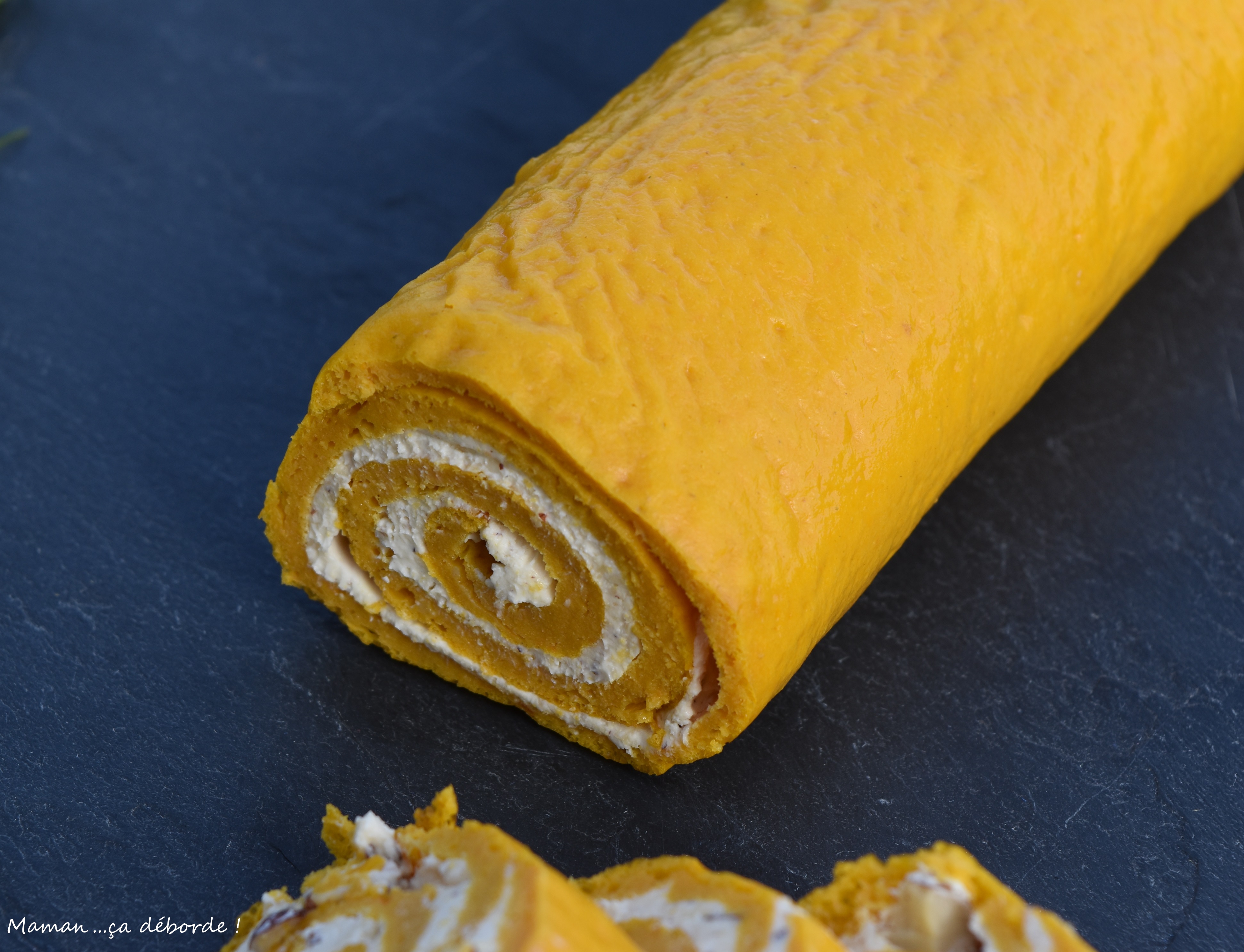 Je me suis très largement inspirée du roulé carotte de Béatrice du blog Cuisine en Folie dont j’ai modifié les ingrédients en fonction de mes envies et simplifié la réalisation compte tenu de ma flemme du jour.