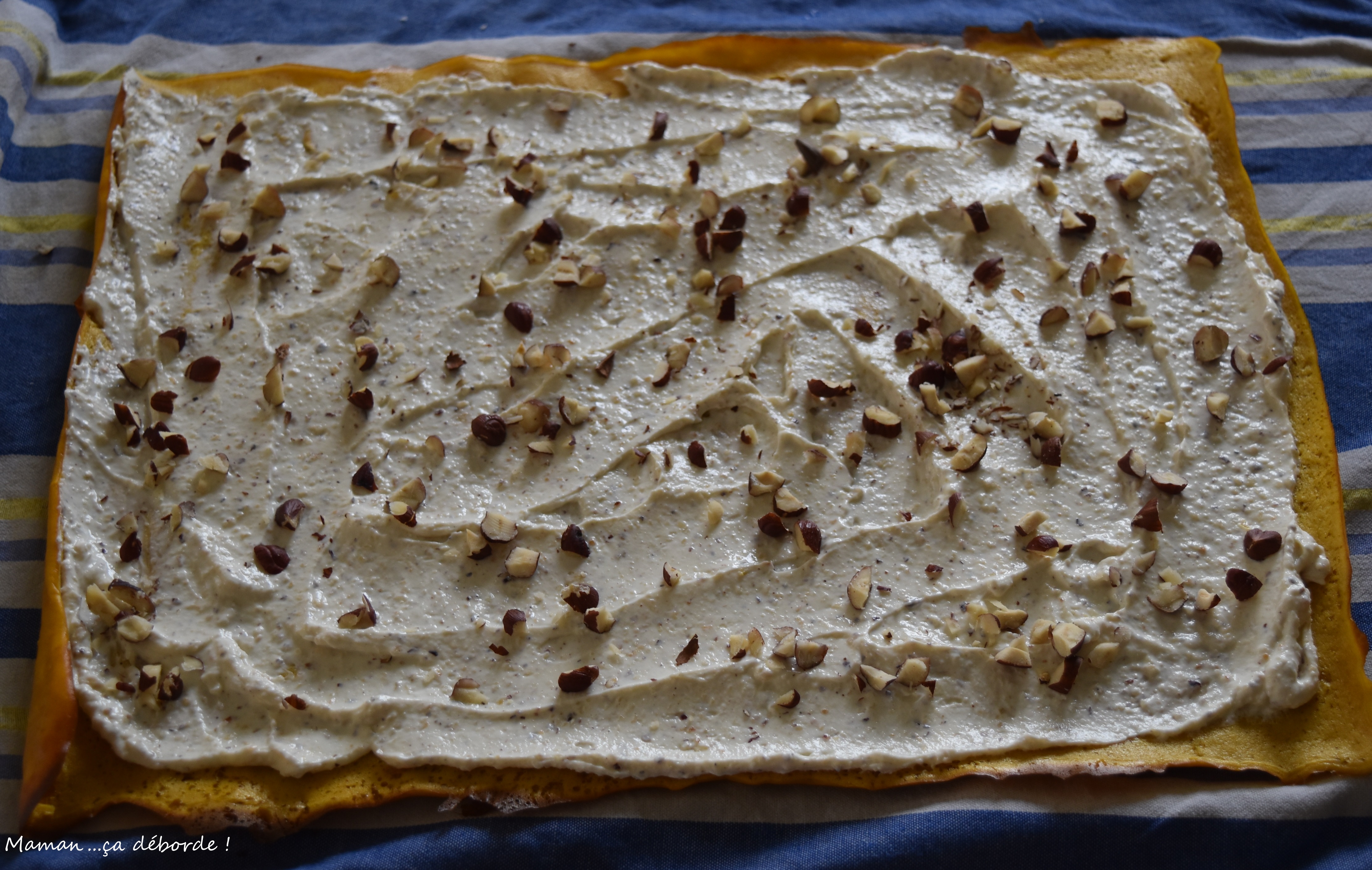 Répartissez la préparation sur toute la surface du roulé puis parsemez de noisettes concassées.